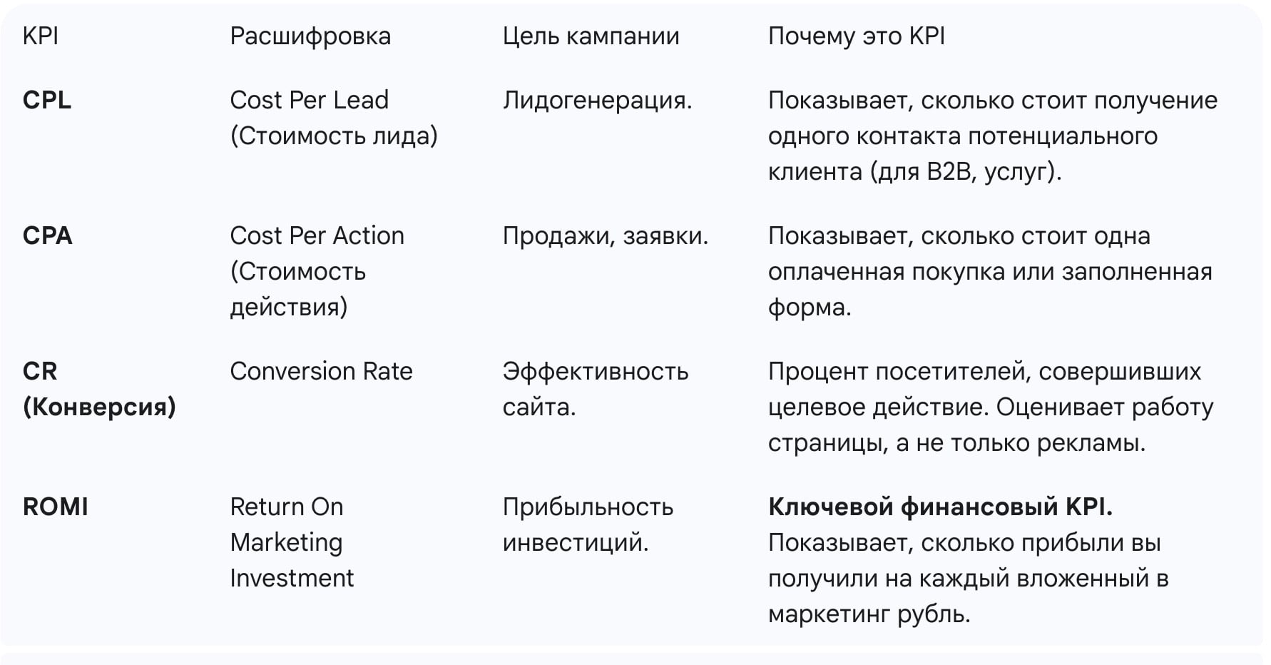 Вывод: Не измеряйте всё подряд. Выбирайте один-два главных KPI, напрямую связанных с финансовыми целями (CPL, CPA, ROMI), и используйте вспомогательные метрики (CPC, CTR) для оперативной оптимизации кампаний.